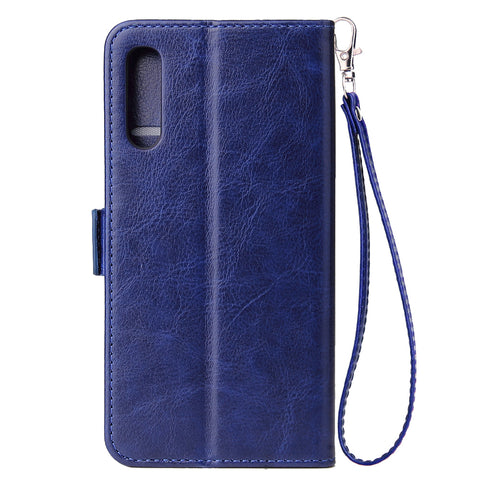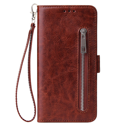 For Samsung A50 Solid Color PU Leather Zipper Wallet Double Buckle Protective Case with Stand & Lanyard brown