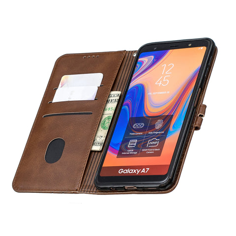 For Samsung A7 2018 Denim Pattern Solid Color Flip Wallet PU Leather Protective Phone Case with Buckle & Bracket red