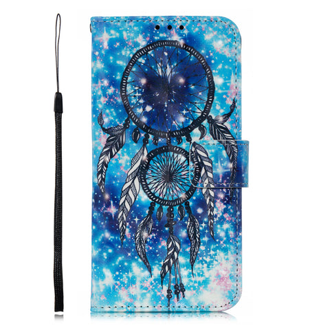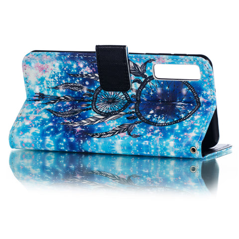 For Samsung A7 2018 3D Coloured Painted Leather Protective Phone Case with Button & Card Position & Lanyard Blue wind chime