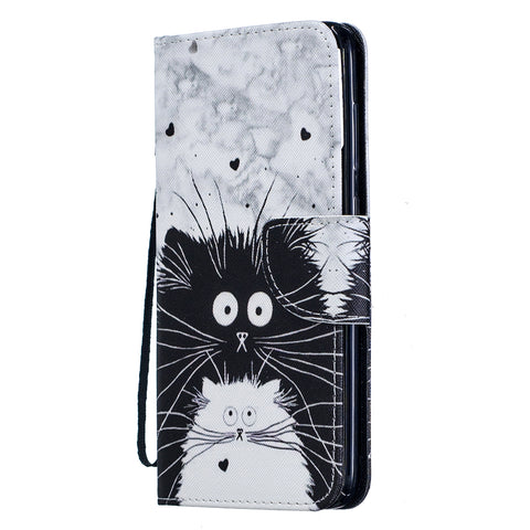 For Samsung A50/A70 Smartphone Case Overall Protective Phone Shell Lovely PU Leather Cellphone Cover with Card Slots Black white cat