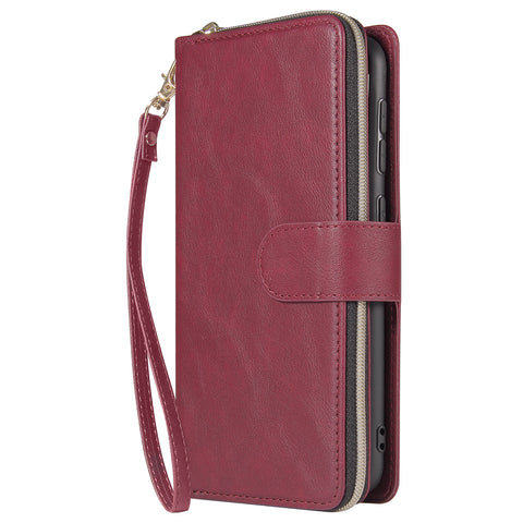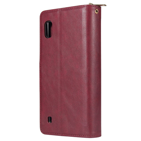 For Samsung A10/A20/A30/A50/A30S/A50S Pu Leather Mobile Phone Cover Zipper Card Bag + Wrist Strap Red wine