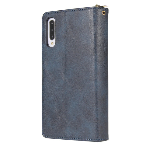 For Samsung A10/A20/A30/A50/A30S/A50S Pu Leather Mobile Phone Cover Zipper Card Bag + Wrist Strap blue