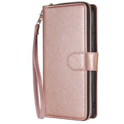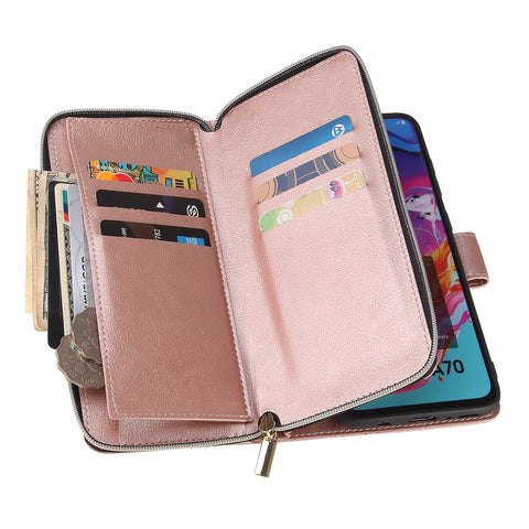 For Samsung A10/A20/A30/A50/A30S/A50S Pu Leather Mobile Phone Cover Zipper Card Bag + Wrist Strap Rose gold
