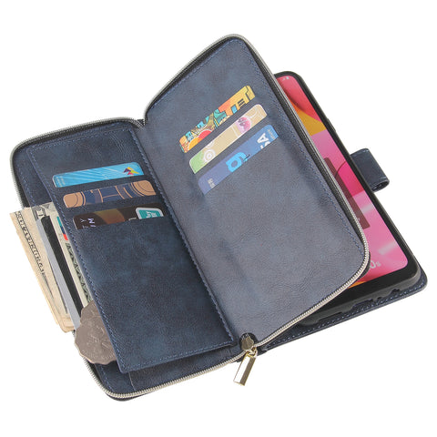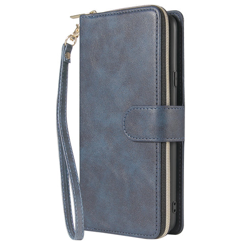 For Samsung A10/A20/A30/A50/A30S/A50S Pu Leather Mobile Phone Cover Zipper Card Bag + Wrist Strap blue