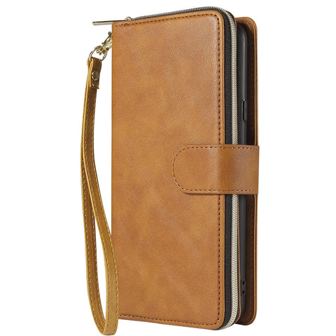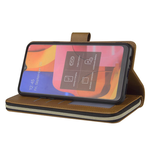 For Samsung A10/A20/A30/A50/A30S/A50S Pu Leather  Mobile Phone Cover Zipper Card Bag + Wrist Strap brown