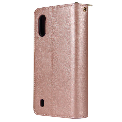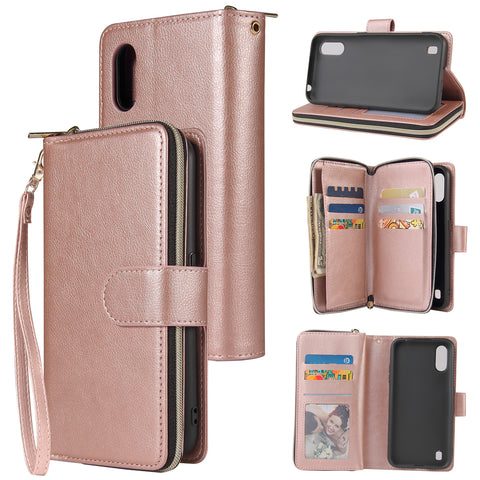 For Samsung A01/A21/A31/A41/A51 Pu Leather Mobile Phone Cover Zipper Card Bag + Wrist Strap Rose gold